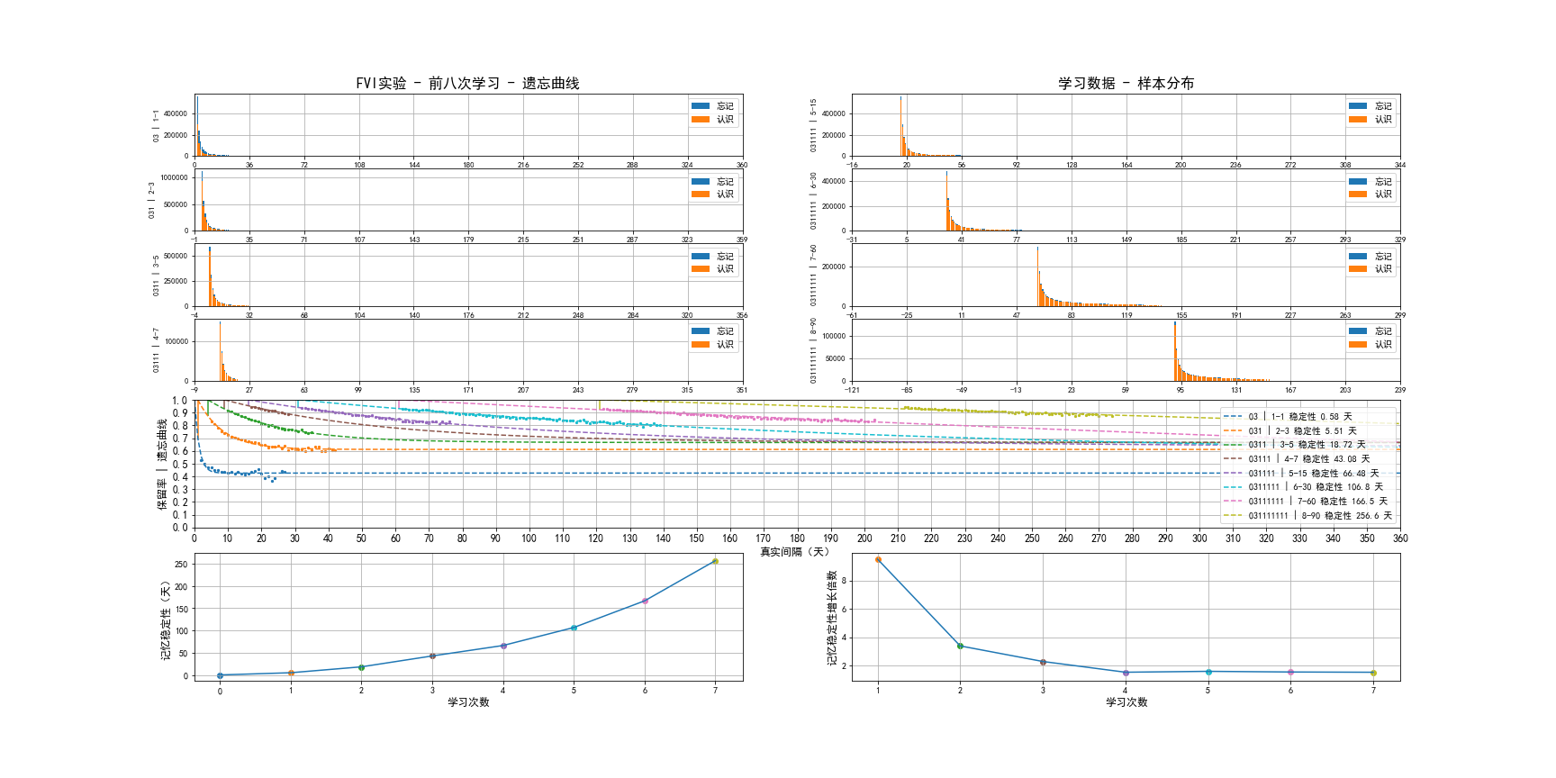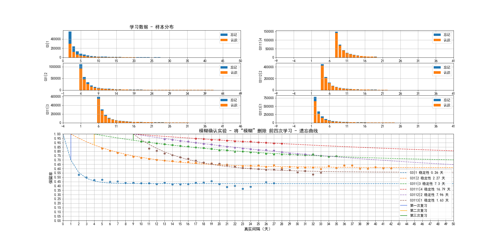 本章抱着“科学严谨、求真求实”的态度出发,使用 MaiMemo 的 FSR 数据验证相关理论的正确性,力求掌握相关算法基本方法,最终复现了遗忘曲线、稳定性增长的现象,印证了部分算法理论。