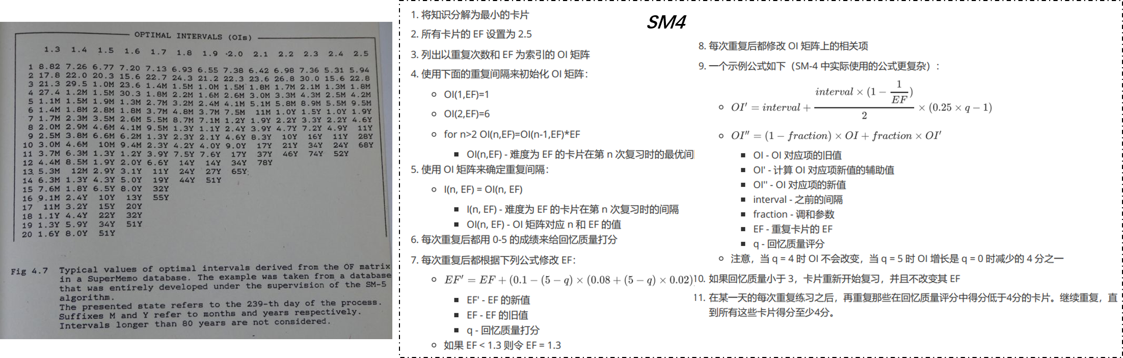 SM-0 算法试图在保留率与重复频率之间取得平衡,它的问题很明显:没有计算机,手动计算间隔和安排复习较为麻烦。并且以页面为单位进行复习,无法追踪每一个项目的记忆情况。