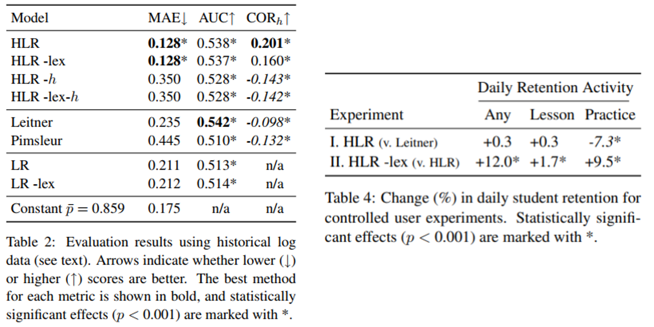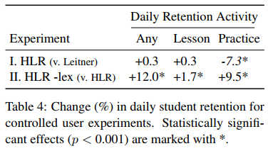 Duolingo 将用户随机分组使用不同的复习算法进行学习规划,收集数据后使用 A/B 测试相关理论进行假设检验,使用留存为关键指标,让人眼前一亮,与我们的研究思路不谋而合。