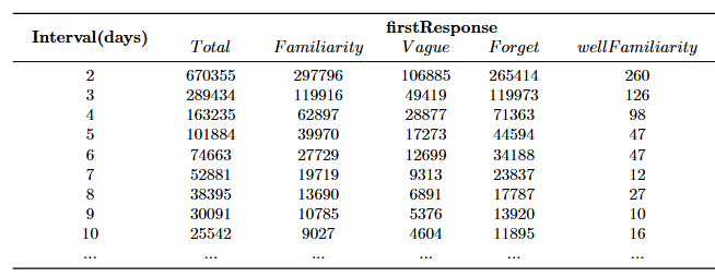 值得补充强调的是,由于目前 FSR 中没有记录真实间隔,我们只能通过第二次学习与第一次的学习记录时间相减才能获得真实间隔,这导致实验复杂度陡增。故建议在 FSR 中加入“真实间隔”,可方便以后的复习算法研究。