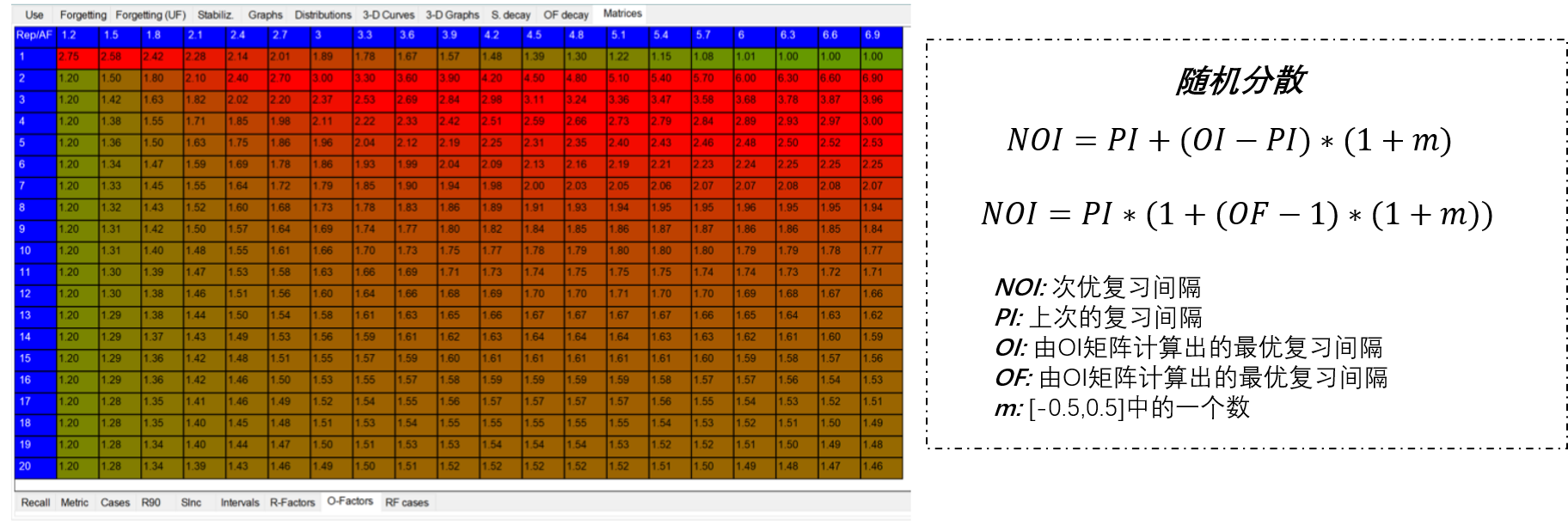 OF : 不再用 EF 来作为两次间隔的比例,而是用 EF 和连续复习次数 n 来定位 OF 矩阵上对应的 OF 值,用 OF 值来作为两次间隔的比例。