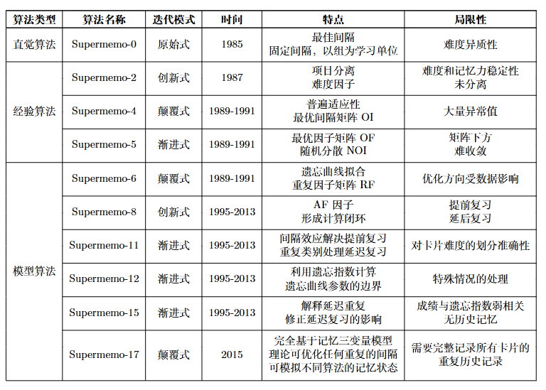 SuperMemo 认为“没有确定的数学标准可以显示一种算法优于另一种算法。学习速度与保留率是用户之间摇摆不定的两个相互矛盾的度量。特别地,学习速度是一个不可靠的概念,因为在低的遗忘指数下可以获得最高速度。从这个意义上讲,设计不良的算法可能反常地实现更高的学习速度。”