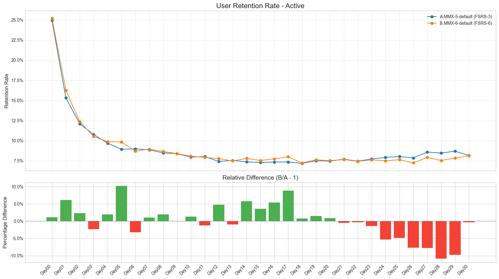 - At the same time, there's a peculiar phenomenon that needs to be addressed: the user retention rate for the A.MMX-5-default (FSRS-3) group actually increased after Day 18 instead of declining, which is counterintuitive.