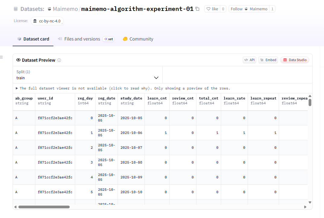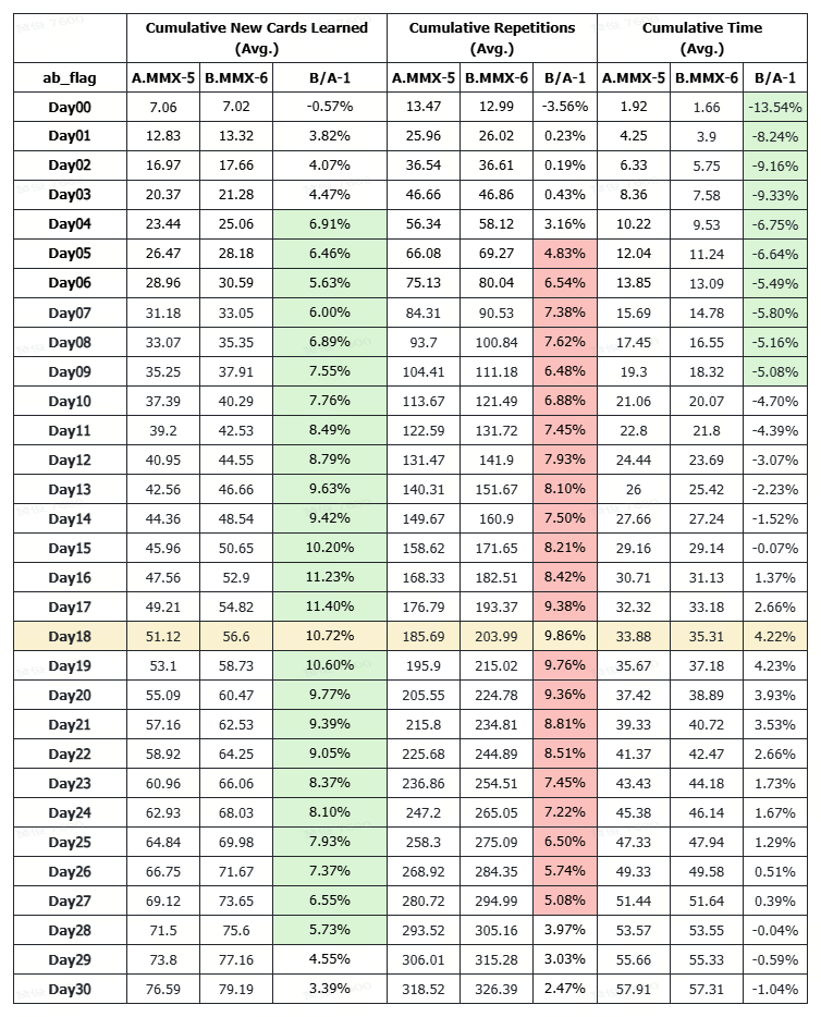 maimemo_flashcard_abtest.tsvfile within the appendix, the relevant data is:acc_learn_cnt: Total number of new cards learnedacc_learn_repeat: Total number of new learning reviewsacc_review_repeat: Total number of review repetitionsacc_total_repeat: Total number of all reviewsacc_learn_time: Total time spent on new learningacc_review_time: Total time spent on reviewsacc_total_time: Total time spent overall