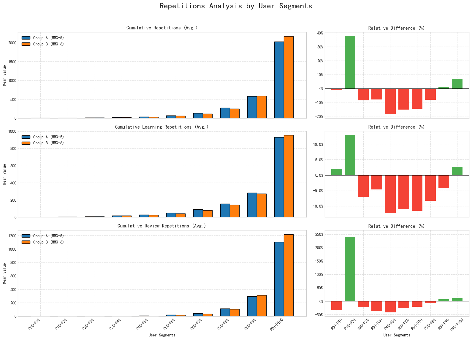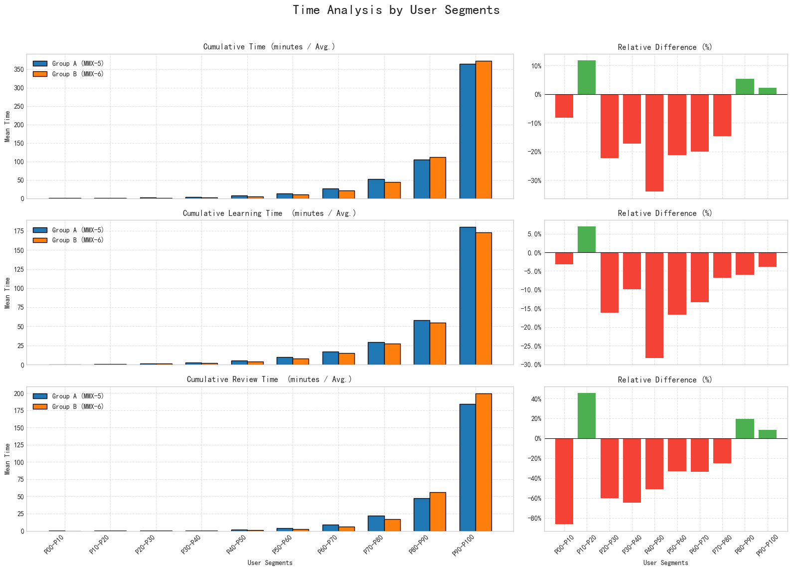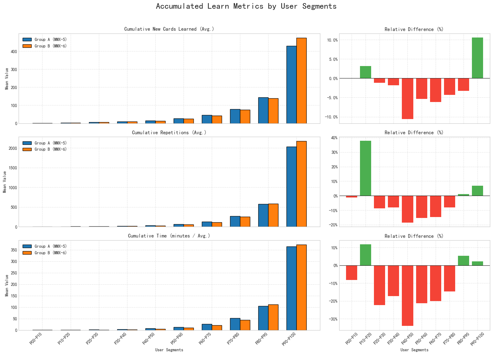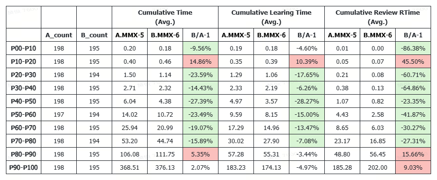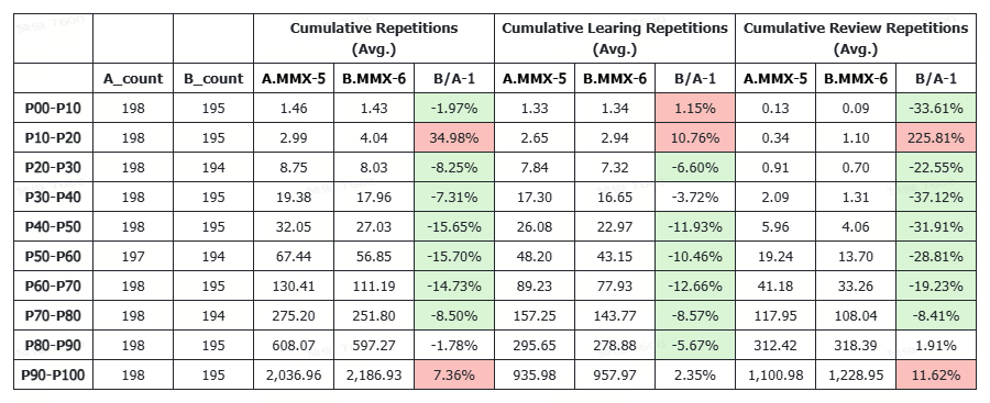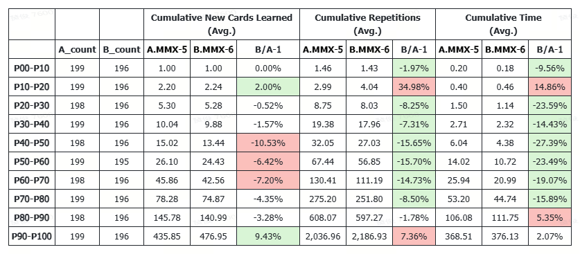 - The users were segmented into 10 deciles (P00-P10 representing the bottom 10% in cumulative new learning, and P90-P100 representing the top 10% or "super users"). We then compared A.MMX-5-default (FSRS-3) and B.MMX-6-default (FSRS-6).