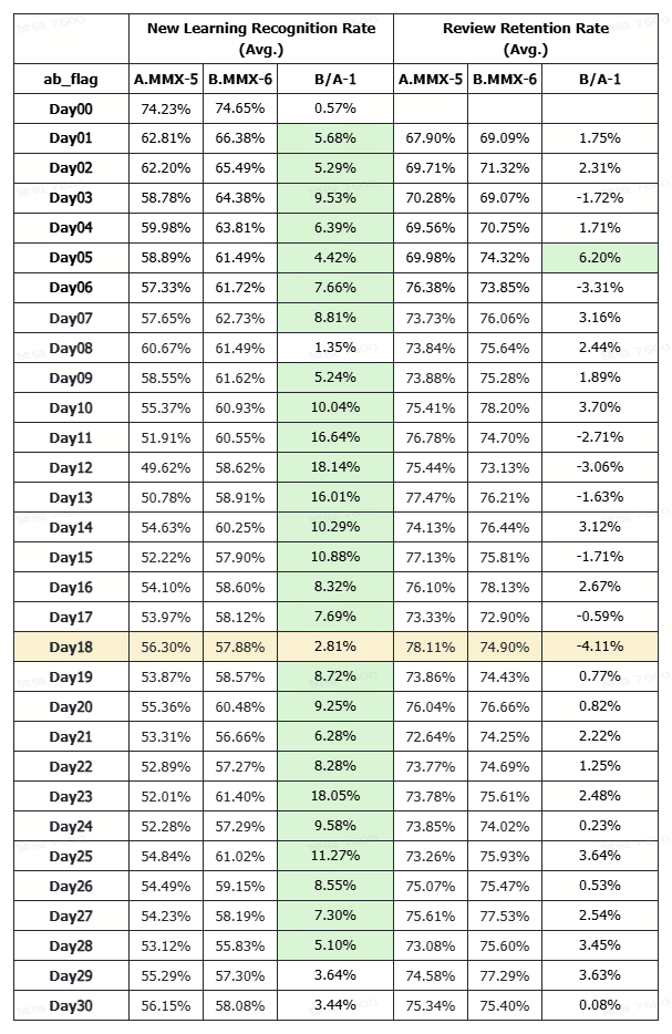 Compared to MMX-5-default (FSRS-3), MMX-6-default (FSRS-6) has shown a negative trend on user retention, with declines in retention rates for both daily active learners and learners who complete their daily tasks. In terms of learning efficiency, it’s difficult to say whether MMX-6-default (FSRS-6) is superior to MMX-5-default (FSRS-3).