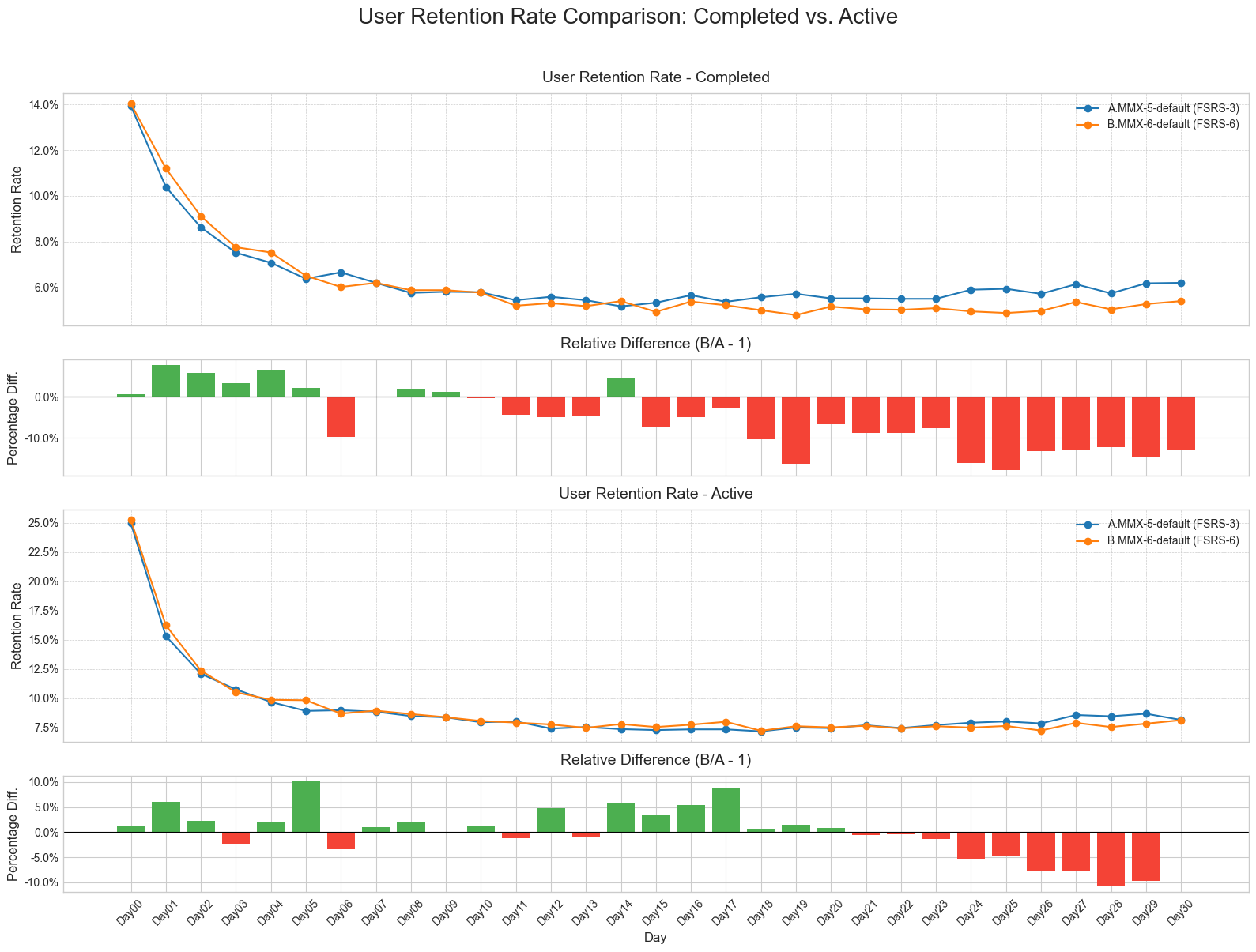 - B.MMX-6-default (FSRS-6) shows a negative trend in user retention compared to A.MMX-5-default (FSRS-3).