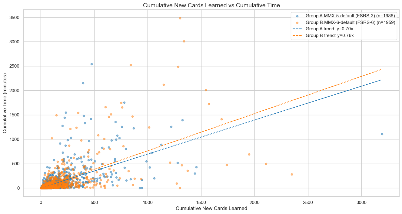 - From the data, the A.MMX-5-default (FSRS-3) learns slightly more in the same amount of time or spends slightly less time learning the same number of cards compared to the B.MMX-6-default (FSRS-6).