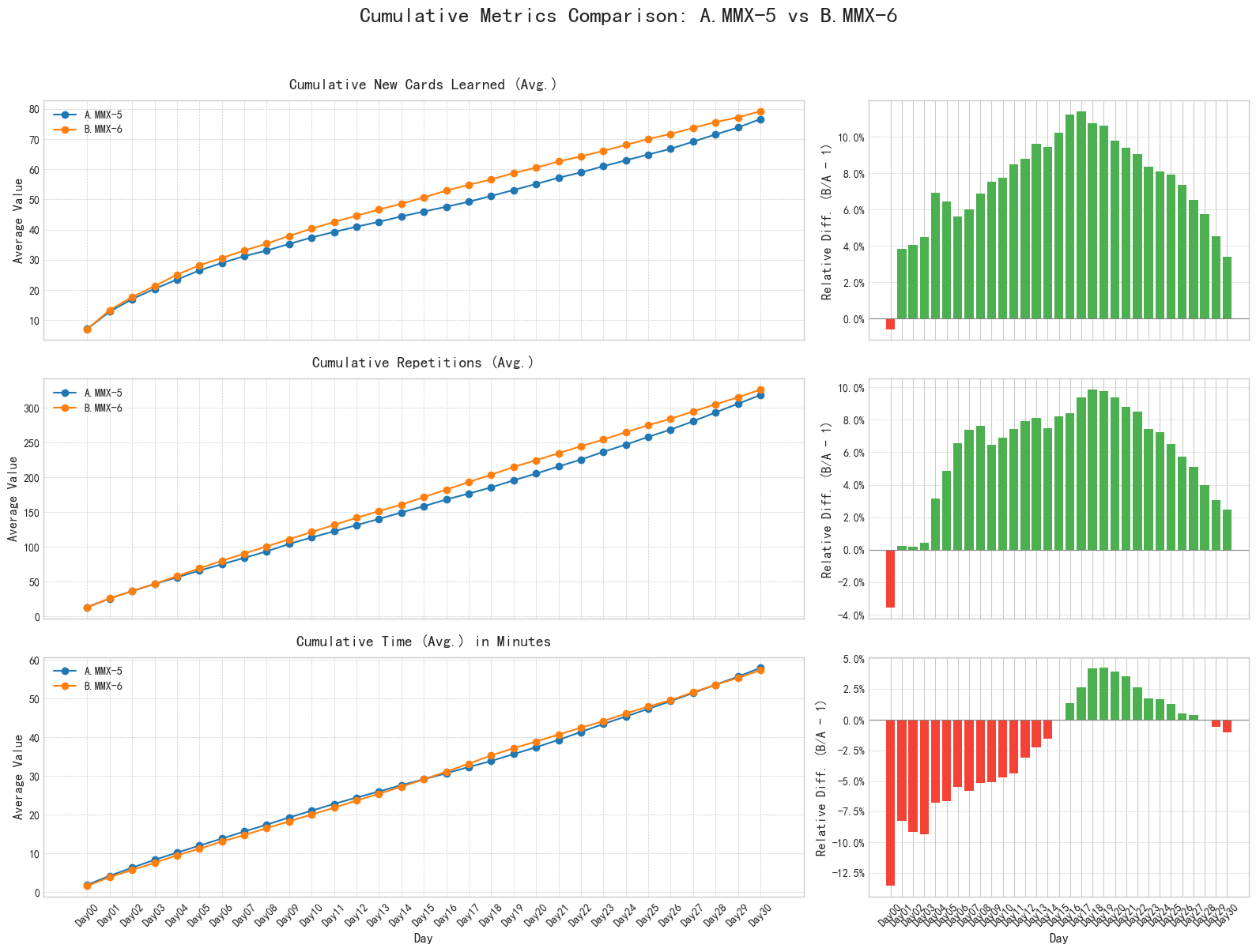 - Before Day 18, B.MMX-6-default (FSRS-6) showed a promising trend in cumulative new cards learned compared to A.MMX-5-default (FSRS-3). However, after Day 18, this advantage gradually diminished.