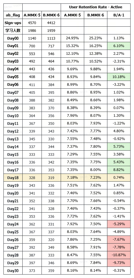 - From the perspective of active learning user retention, the rate is acceptable before Day 20, but there's a declining trend after Day 20.