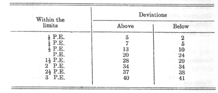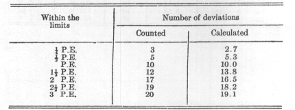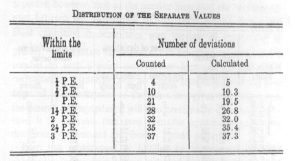 对实际关系的检验,诚然有点困难,但完全证实了上述说法。在 84 次测试(每次 6 个 16 音节序列)中,√n = 2.45。我们发现这 84 次测试的观测或然误差为48.4。而 504 个单个数值的或然误差是 31.6。商数 31.6 : 48.4 = 1.53;因此,还不到 √n 值的三分之二。