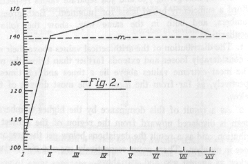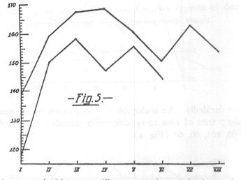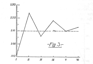我只在一个案例中注意到了与此假设相符的情况,即在那个包含 92 次测试(每次 8 个 13 音节序列)的大型且因此很重要的系列中。在这种情况下,92 个第一个序列、92 个第二个序列……的平均学习时间分别为 105、140、142、146、148、140 秒,其相对长度由图 2 展示。而对于我所研究的所有其余案例,典型的情况恰恰相反,其数值的变化过程更类似于那个包含 84 次测试(每次 6 个 16 音节序列)的系列,如图 3 所示。