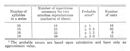 这里只涉及七次测试(1884 年),每次测试包含六个诗节。当这些诗节被逐一学习至首次可能再现的程度时,学习所有六个诗节总共平均需要 52 次重复(P.E.m = ± 0.6)。因此,每个诗节几乎只需要九次重复;或者,如果我们扣除那次无误的再现本身,则仅需八次重复。[2]
