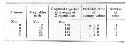 所讨论的序列(在 1883-84 年的测试中)分别包含 12、16、24 或 36 个音节,每次实验会将 9、6、3 或 2 个这样的序列组合成一次测试。