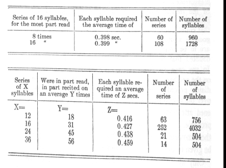 - 我没有尝试通过发明特殊的、助记术(mnemotechnik) [原文如此] 类型的联想来串联这些无意义音节;学习过程完全依赖于纯粹的重复对自然记忆所产生的影响。由于我本人对各种助记技巧毫无实践知识,因此遵守这一条件对我而言毫无困难。
