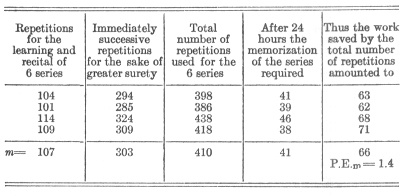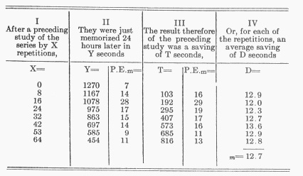 在我个人的案例中——在合理的限度内——12 音节序列的重复在 24 小时后的后效要略小于16音节序列;其后效必须被估计为至少是总重复次数的十分之三。如果这种关系在大规模重复时能近似地继续成立,那么我们有理由预期,那些初次学习时所耗费的重复次数已达掌握所需次数四倍的序列,在 24 小时后应该可以不费吹灰之力地被背诵出来。然而,在所考察的案例中,重新学习仍需花费初次学习所需功的大约 35%。平均 410 次重复的效果,仅仅节省了这一总功的六分之一。如果说,最初的那些重复能贡献其自身次数约十分之三的节省,那么后续的那些重复的效果必定已是微乎其微。