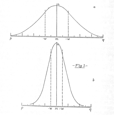 对于每一次与中心值完全吻合的观测,就在垂直线 m n 上放置一个一平方毫米的方块。对于每一个比中心值高一个单位的观测值,就在 m n 右侧一毫米处的垂直线上放置一个方块,以此类推。对于每一个比中心值高(或低)x 个单位的观测值,就在距离 m n 右侧(或左侧)x 毫米的垂直线上放置一个方块。当所有观测都以此方式排列后,图形的外部轮廓可以被平滑化,使得单个方块的突出边角转变为一条对称的曲线。现在,如果各项测量值的性质,使得它们的中心值可以被视为物理科学概念中的常数,那么最终形成的曲线形态就是图 1 中标记为 a 和 b 的那种。如果中心值是一个统计常数,那么曲线可以是任何形态。(曲线 a、b 与直线 p q 在每种情况下都围成一个 1000 平方毫米的面积。严格来说,这只有在曲线和直线 p q 无限延长时才成立,但这两者最终会彼此非常贴近,以至于在图形的中断处,曲线的两端各自只缺少两三个平方毫米的面积。)对于某一组观测,其形成的曲线是更陡峭还是更平坦,取决于观测的性质。观测越精确,数值就越会聚集在中心值周围,大的偏差就越少出现,曲线也就越陡峭,反之亦然。除此之外,曲线的形成规律总是一样的。因此,如果一个人在任何特定的观测组合中,获得了衡量观测值分布密集程度的某个指标,他就能概览整个群体的分布情况。例如,他可以说明某个特定数值的偏差出现的频率,以及有多少偏差落在某个范围之内。或者——正如我将在下文展示的——他可以说出多大的变异范围,能将所有观测值中的某个百分比包含在它与中心值之间。例如,我们图中的 +w 和 -w 两条线,恰好界定出了代表所有观测的总面积的中心一半。但在 1b 所示的更精确的观测中,它们与 m n 的距离只有 1a 中的一半。因此,它们相对距离的陈述,也提供了一个衡量观测精确度的指标。
